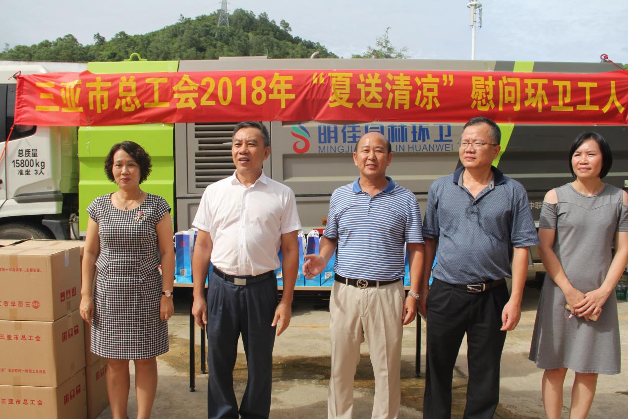 为进一步落实防暑降温措施,关爱高温天气下户外作业的环卫工人,7月25日下午,三亚市人大常委会副主任、市总工会党组书记、主席张羽飞一行来到明佳园林环卫集团有限公司开展“夏送清凉”慰问活动,看望慰问在高温天气下坚守岗位的一线职工,并给一线职工发放了防暑降温慰问品。市总工会副主席林火英陪同慰问。