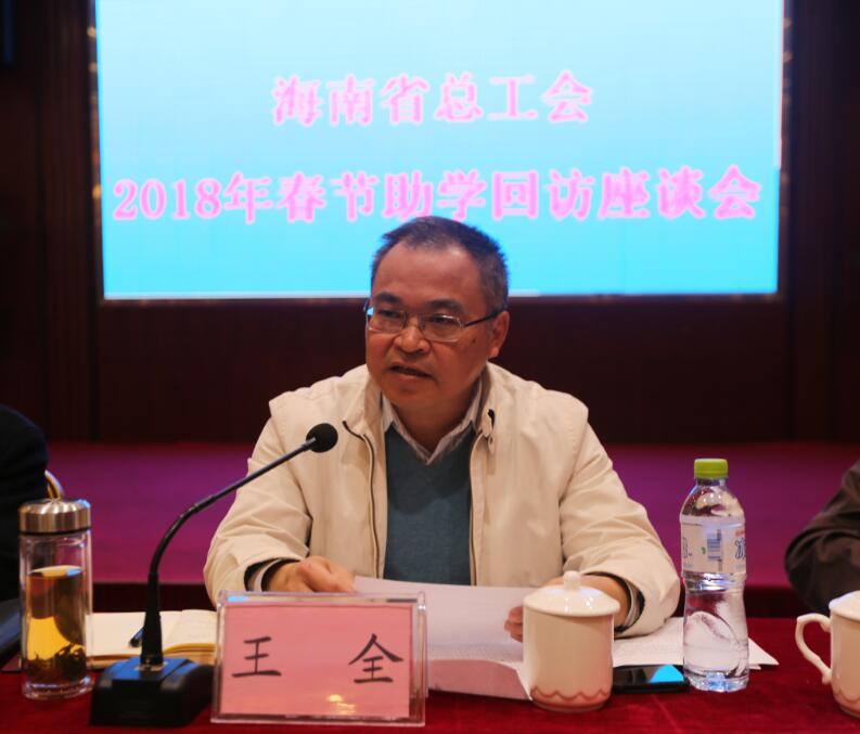 2月6日上午,省总工会在海口举行2018年春节回访座谈会。省总工会党组书记、常务副主席王全出席并讲话,省财政厅副厅长杨传喜、省教育厅调研员朱永国出席座谈会。座谈会由省总工会副主席郭奕秋主持。