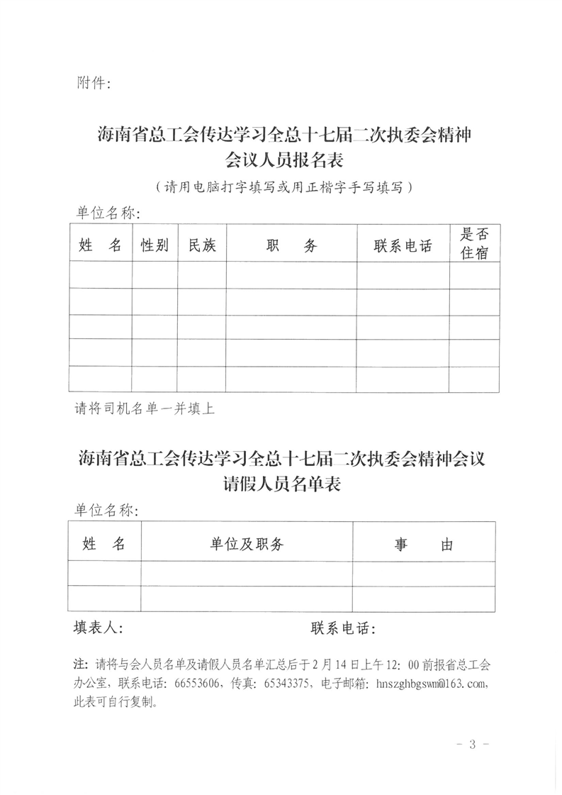 注:请将与会人员名单及请假人员名单汇总后于2月14日上午12:00前报省总工会办公室,联系电话:66553606,传真:65343375,电子邮箱:hnszghbgswm@163.com,此表可自行复制。