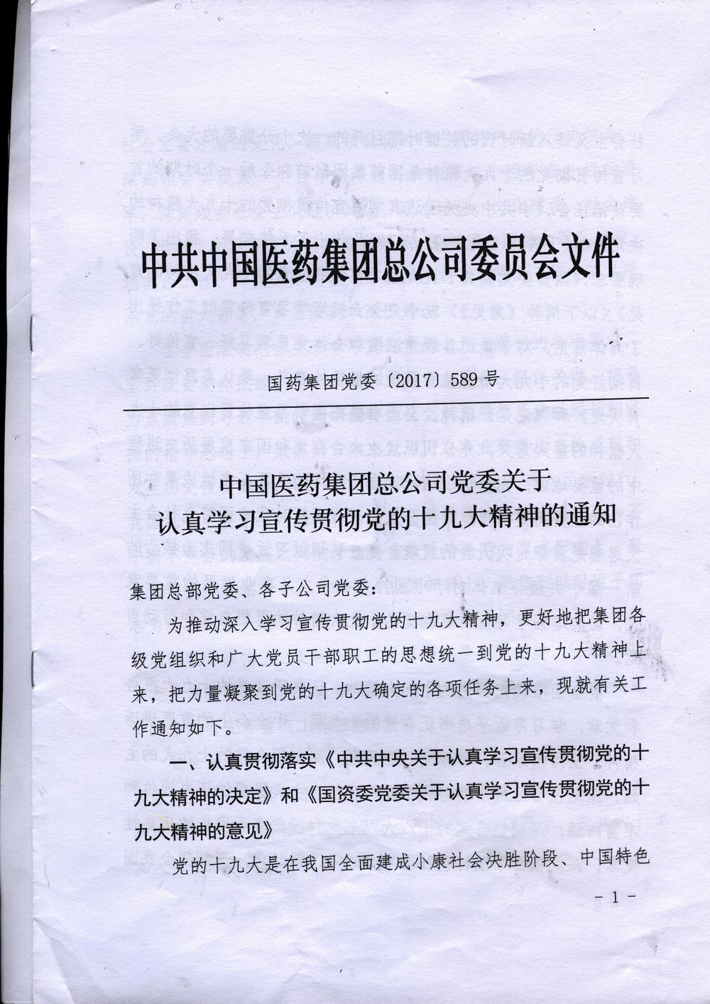 中国医药集团党委关于认真学习宣传贯彻党的十九大精神的通知